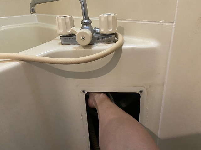 水栓下の点検口を開けて、専用工具を用いて水栓を外していきます。