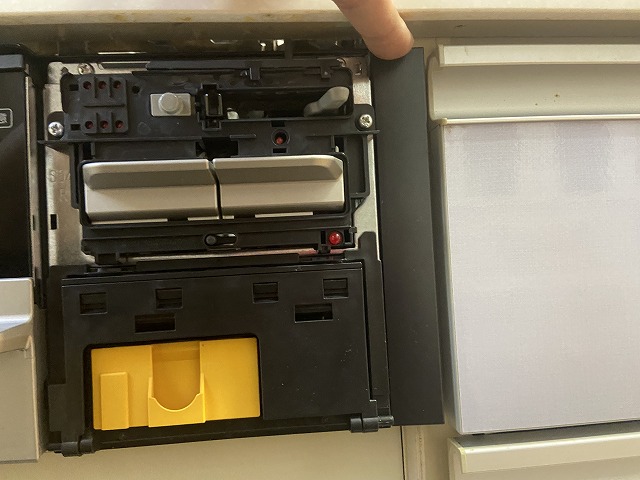 正面パネルと周囲の引き戸の出幅を合わせ、コンロ本体の左右の寄りを確認していきます。