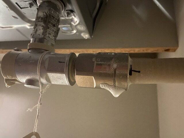 ビルトインコンロを固定した後はガス接続を行い、ガス漏れチェックをしていきます。