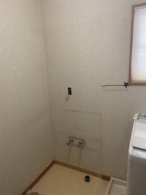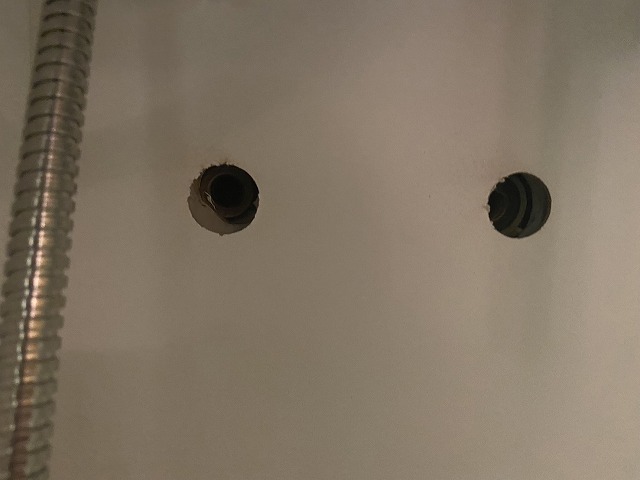 新しく取り付けた洗面化粧台は前の洗面化粧台よりも少し低くなったので、以前のビス穴が見えてしまいます。