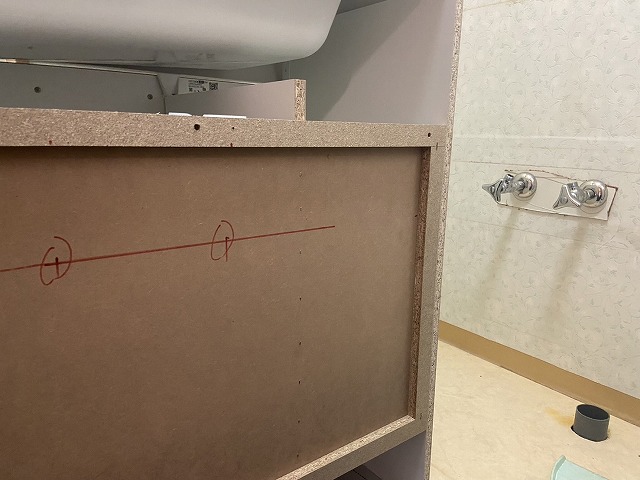 次に、止水栓の位置に合わせて新しい60cm幅の洗面台の背面に穴を開けていきます。
