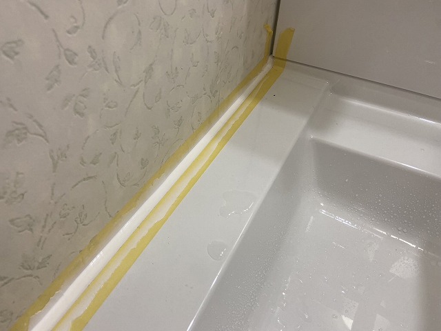 最後に洗面化粧台を壁との間をコーキングで止水処理していきます(幅などによってしないこともあります)。